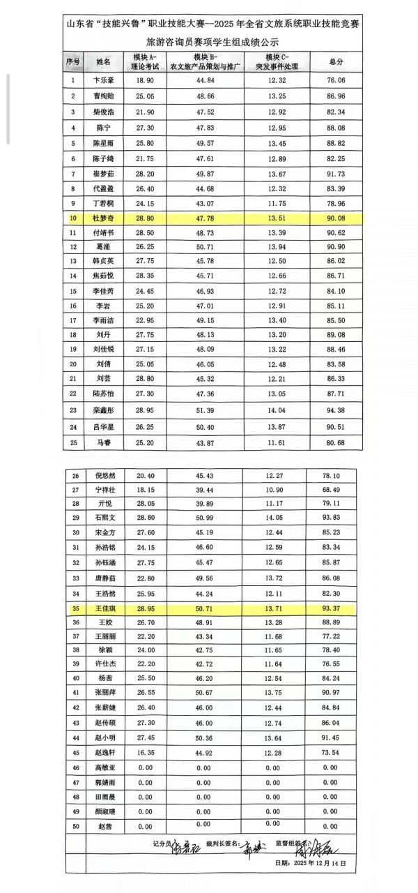 12月14日,2025年山東省“技能興魯”職業(yè)技能大賽全省文旅系統(tǒng)旅行社咨詢員賽項圓滿落幕,聊城職業(yè)技術(shù)學院學生表現(xiàn)亮眼,在劉寶平老師和李雁老師的辛勤指導與精準賦能下,王佳琪斬獲一等獎,杜夢奇榮獲二等獎。