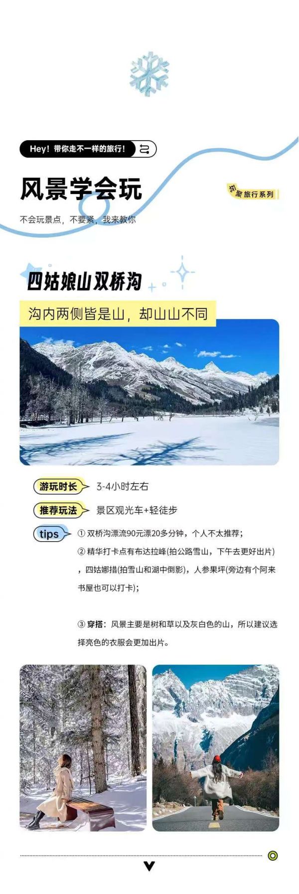 從都江堰出發,前往四姑娘山雙橋溝。雙橋溝內風景如畫,有雄偉的雪山、幽深的峽谷、清澈的溪流和茂密的森林。乘坐觀光車深入景區,沿途可以欣賞到各種美麗的自然風光。您可以在觀景臺下車,拍照留念,也可以徒步探索,感受大自然的寧靜與美麗。游覽完雙橋溝后,返回成都散團,結束這段難忘的旅程。在這六天的時間里,您領略了四川的自然風光和人文魅力,帶著滿滿的回憶和收獲,踏上歸程。回到聊城溫暖的家。