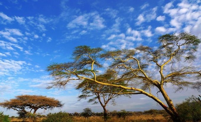 塞倫蓋蒂國家公園是坦桑尼亞最著名的國家公園,一個有著300多萬只大型哺乳動物的巨大生態(tài)系統(tǒng)植被以開闊草原型植物為主,但在嚴重干旱時幾乎全部變?yōu)樯衬V饕参锸邱R唐和鼠尾粟(鹽堿土壤的代表植物)等茅草。在較濕潤地區(qū),水蜈蚣屬植物生長占優(yōu)。公園中部為大片金合歡林地草原。