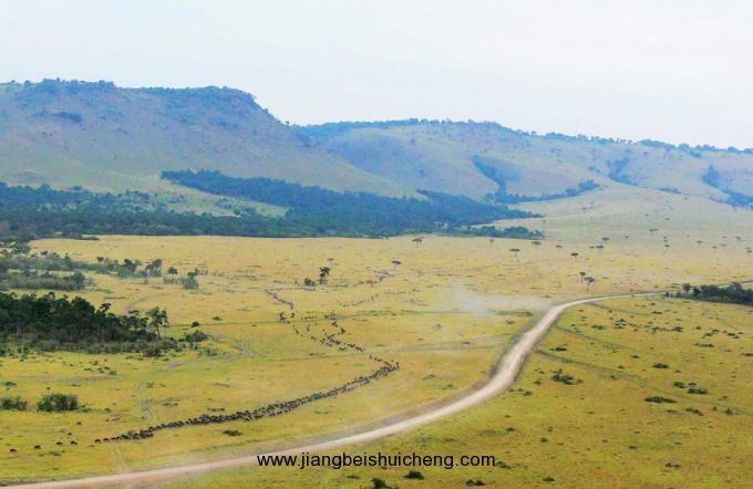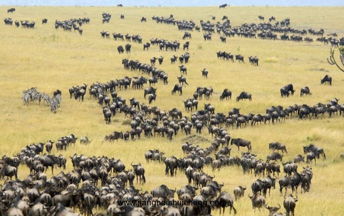 在塞倫蓋蒂草原上發(fā)生的一年一度的動物大遷徙是這個世界上最偉大的自然景觀,動物們靠遷徙的方式找尋水源和牧草。從空中俯瞰,遷徙的場面尤為壯觀--每年大約有150萬只牛羚和斑馬會在塞倫蓋蒂大范圍地巡游一周,它們就像一個巨大的隆隆作響的割草機在草原上一掃而過,還給大地的是平均每天450噸的糞便。除了牛羚和斑馬是這個舞臺的主角以外,走在這條遷徙路上的還有約30萬只湯姆森瞪羚和3萬只格蘭特瞪羚。不斷壯大的遷徙隊伍形成了一個觸目驚心的浩浩蕩蕩的獸群。