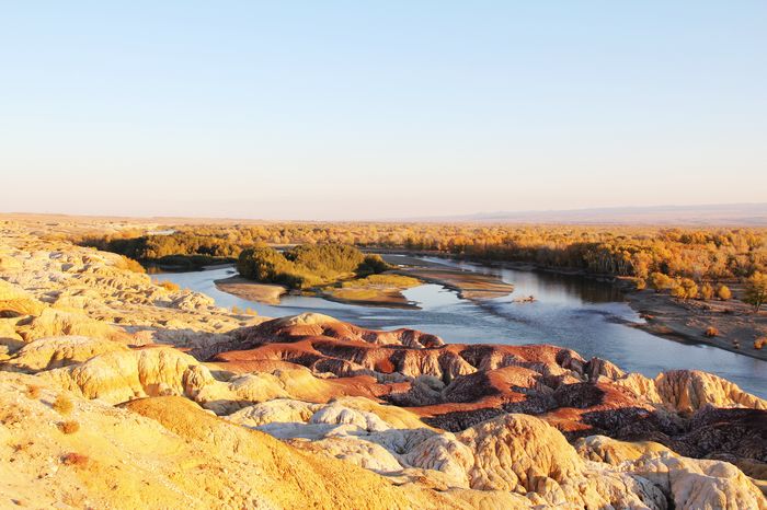 五彩灘位于阿勒泰地區(qū)布爾津縣境內(nèi),額爾齊斯河北岸,它是懸崖式的雅丹地貌,山勢(shì)起伏、顏色多變,這里的巖石以紅色為主,間以綠、黃、白、黑及過(guò)渡色彩,在不同光線照耀下,更加色彩斑斕、嬌艷嫵媚, 一般的雅丹地貌周圍都是戈壁荒漠景觀,但五彩灘的奇妙和非凡之處在于,它處在美麗的額爾齊斯河谷里,河對(duì)面是一片郁郁蔥蔥的綠洲,截然不同的地貌,就這樣唇齒相依般依偎在一起,一河隔兩岸,儼然兩重天,對(duì)比強(qiáng)烈又渾然天成。因此五彩灘被稱作新疆最美的丹雅景觀。
