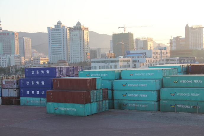 每一批貨物都有著膠東海運(yùn)的標(biāo)志,而他們排放的整齊性就說明了碼頭工人的工作的責(zé)任性,這些整齊而又有些小規(guī)模的貨物,就說明了威海碼頭的運(yùn)輸?shù)凝嫶笮浴?br />