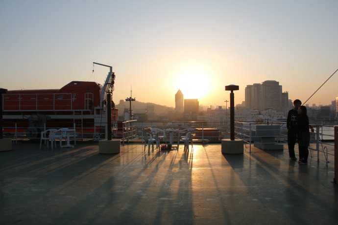 看,這艘船的甲板上,既有提醒游客的熱心性。還為甲板上增添了一道亮麗的風(fēng)景線,而翻譯成的韓文,就足以說明了威海碼頭的國際性。