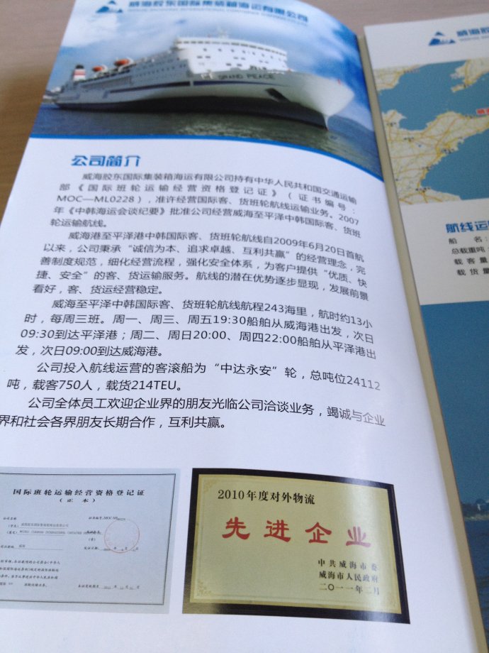 這是威海膠東國際集裝箱海運(yùn)有限公司的簡介以及他們所獲得獎項(xiàng),而看到這些也讓我對威海碼頭更加從滿了信任。