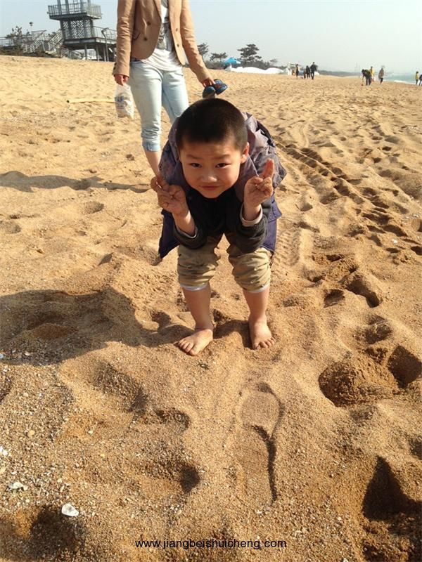 你看那個小男孩兒,被海浪打上來了吧,還是老實點兒玩沙子吧