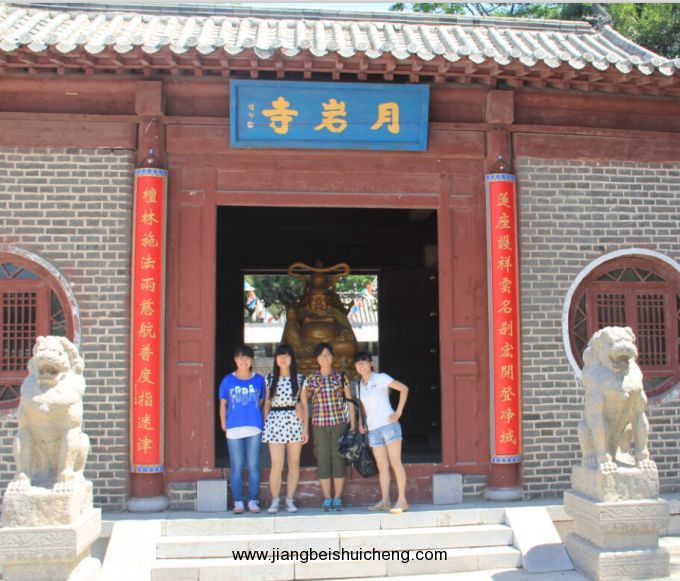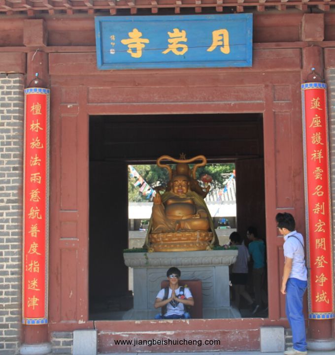 山坡上有一條新修建的臺(tái)階路,直通山頂。據(jù)當(dāng)?shù)乩相l(xiāng)說(shuō),上面有一尊大佛,還有古長(zhǎng)城圍墻。于是,雖然天氣炎熱,我們還是想一探究竟。臺(tái)階較陡,拾級(jí)而上不多時(shí)就汗流浹背氣喘吁吁。在半山腰山道左邊,一尊面目慈祥的石雕坐佛依山望湖。再往上,很快就登頂了,發(fā)現(xiàn)所謂的古長(zhǎng)城圍墻不過(guò)是用碎石堆砌而成。下山之后,我們繼續(xù)驅(qū)車(chē)?yán)@山而行,至山的背面,有一月巖寺。月巖寺坐落在昆山的西側(cè),一說(shuō)創(chuàng)建于漢代,一說(shuō)始建于唐代。其藏居深山,古樹(shù)掩映,晨鐘暮鼓方知山中有寺。