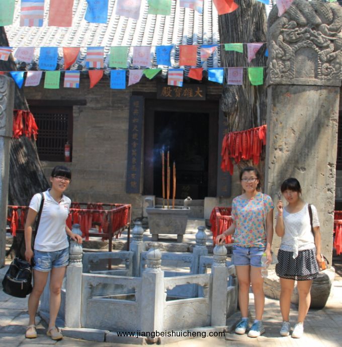 寺院有大雄寶殿、藏經(jīng)閣以及左右配殿和后殿,為前后雙重院建筑。殿內(nèi)雕梁畫(huà)棟,繪滿(mǎn)壁畫(huà),甚為美觀。殿前唐柏兩棵,一為“雀柏”,一為“血柏”,樹(shù)干粗大,參天蔽日,掩映佛殿。院內(nèi)左前方有明代萬(wàn)歷七年重修的全石質(zhì)結(jié)構(gòu)鐘樓,四角攢頂,石柱上題記多處,造型精美,是不可多得的明代鐘樓建筑。寺院東即為“馬跑泉”、石室洞奇觀,洞口上有清康熙年間地方名人馬光遠(yuǎn)書(shū)寫(xiě)的泉名。通過(guò)玻璃,發(fā)現(xiàn)洞內(nèi)泉水依稀看見(jiàn),據(jù)說(shuō)終年不斷,流出洞外順著人工開(kāi)鑿的石槽流入寺內(nèi)荷花池內(nèi)。寺內(nèi)一操四川口音的年長(zhǎng)和尚,熱情地給人們作著講解。