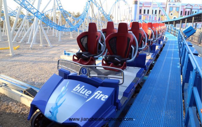 鎮園之寶世界之最——藍火過山車,由德國馬克公司原裝進口,總造價1.2億,全長1098米,至高點38米,最高時速可達100公里,采用火箭發射式原理,讓游客體驗瞬間離地的超刺激、驚險快感。