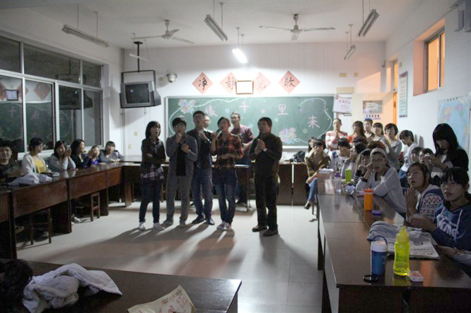 【網宣部】2012年10月12日晚,聊之旅旅行社運營總監劉寶平參加聊城職業技術學院旅游管理學院2012級旅游管理班“有緣千里來相會”主題文藝晚會,劉老師與同學們一起歌唱,贏得了同學們的一陣陣掌聲。