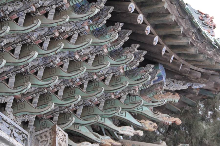 春秋閣為會館最后面、最高大的殿宇。面闊3間,上下2層,單檐歇山,灰筒瓦頂,斗拱抬梁式結構。閣前廊有四根木質檐柱,前廊額枋均為木刻透雕,雕飾人物和牡丹、金瓜、花卉等。