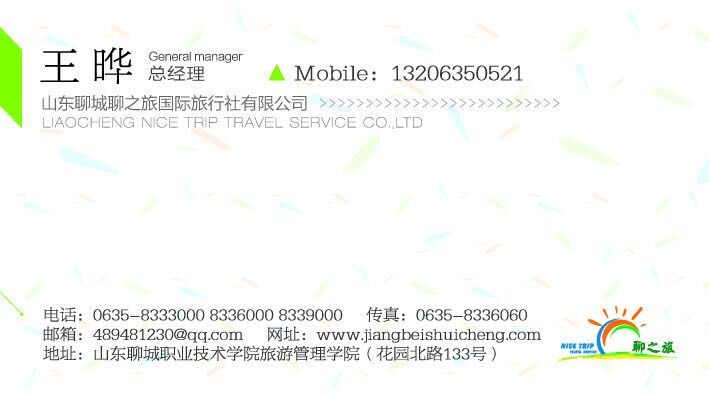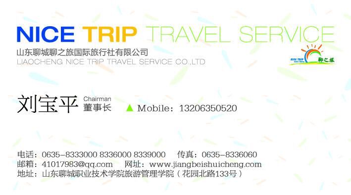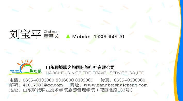 電話:0635-8333000 8336000 8339000 傳真:0635-8336665 地址:山東省聊城市東昌府區興華東路7號 郵編:252000 官方網站:www.dragonbride-bb.cn 歡迎致電全國統一(免長途)熱線:400 0635 369 國內旅游請按1 國際旅游請按2 聊城旅游請按3 票務會議租車請按4 人工請按0 版權所有:Copyright(C) 劉寶平工作室_Mr.Liu Stu 聊城市旅游攝影協會 「我們」? 商會丨俱樂部丨實業公司 山東聊城聊之旅國際旅行社有限公司