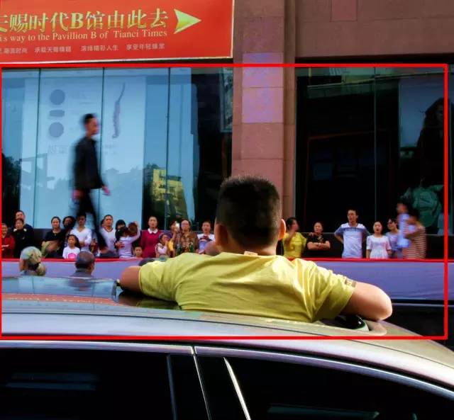點評:T臺表演者的虛化,靜止清晰的男孩,慢速拍攝能更好地表現虛實、動靜的對比。但是,作者采取正方形的構圖不妥,左上角的紅色廣告牌有些搶戲,下部的車窗影響視線。剪裁后,畫面更簡潔明了。