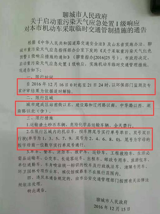 限行時間:自2016年12月16日0時起至21日24時(以環保部門監測及專家評審結果為依據適時解除)
