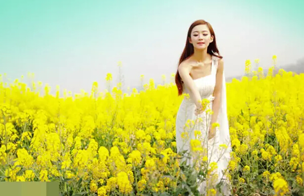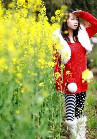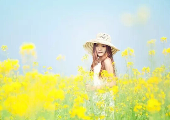油菜花屬于清新系列的色調(diào),搭配的服裝,顏色一定選擇淺色系的,千萬不要想著去和花爭艷,穿個(gè)大紅大紫的。