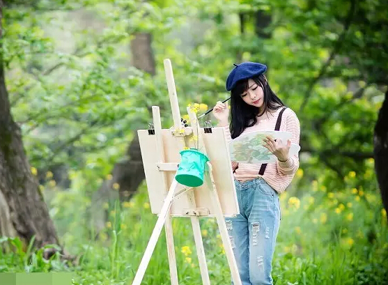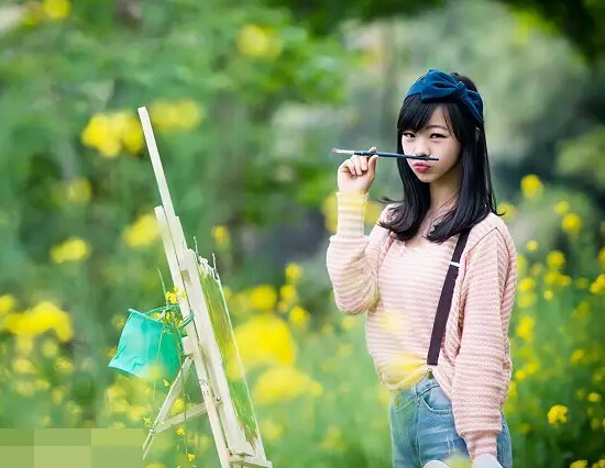 3、高級(jí)——畫板,帶著畫板,整個(gè)構(gòu)圖就會(huì)更豐富,表情一定要夠生動(dòng),要展現(xiàn)一個(gè)在油菜花地里寫生的文藝狗,但是用畫板的話一定要注意構(gòu)圖,注意畫板擺放的角度和位置。