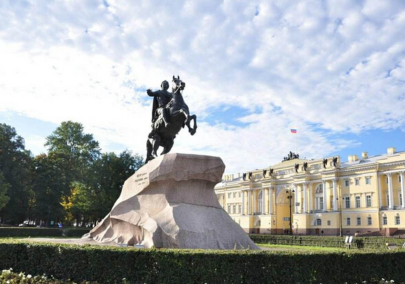 【十二月黨人廣場和青銅騎士像】(約15分鐘)坐落在圣彼得堡涅瓦河岸,鄰近海軍司令部大樓,廣場中央有一個圓形的大草坪,中央豎立著彼得大帝青銅騎士像,它是由普希金的抒情詩而得名。這里是城市的標志和歷史印記點。