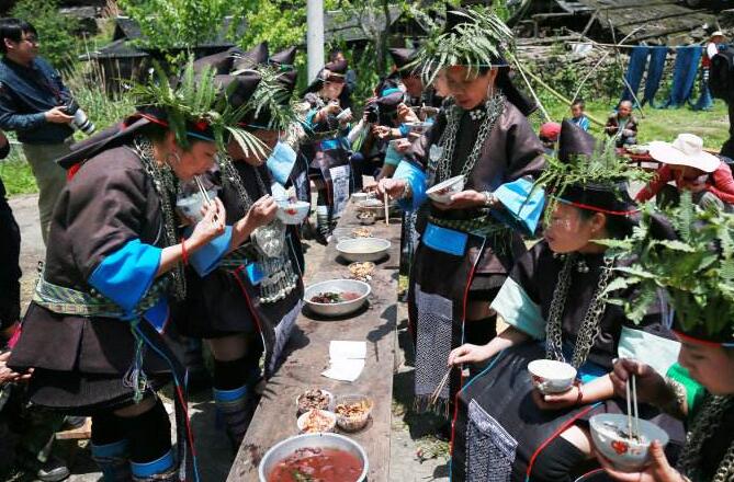 早餐后前往空申村寨依山而建,四周山巒起伏,林木蔥蔥,一條清澈的小溪從寨旁流過(guò),民居布局合理,吊腳樓鱗次櫛比。這里最為世人矚目的是每年一度的“茅人節(jié)”。每年農(nóng)歷二月至三月,成年男女青年不論年齡大小,結(jié)婚已否,凡自己樂(lè)意都可以任意找與自己情意相投的伴侶結(jié)隊(duì)到茅人坡扎茅人、對(duì)情歌、逗趣。特別意合情投者,則相互暗示,離群另尋靜處。節(jié)日氣氛熱烈、奔放、自由、浪漫。農(nóng)歷三月三,被譽(yù)為“世界超短裙故鄉(xiāng)”的榕江縣兩汪鄉(xiāng)空申苗寨人山人海,熱鬧非凡,苗族同胞歡聚一堂,慶祝自己最古老的“情人節(jié)”——茅人節(jié)。茅人節(jié)(古老的苗族情人節(jié))苗語(yǔ)為“撈沙麗”,又稱(chēng)作“爬茅人坡”、“插茅人”。相傳,短裙苗族古時(shí)有本寨男女不通婚的習(xí)俗,婚姻由父母包辦,姑娘都要遠(yuǎn)嫁他鄉(xiāng),許多同寨青梅竹馬的男女不得不勞燕分飛。遠(yuǎn)嫁的姑娘陽(yáng)春三月均要返回娘家?guī)椭焊谧髦啵齻儽銕е叭卖巍毖s寨里的未婚姑娘和小伙子到山上唱歌,用歌聲抒發(fā)與心上人被迫分離,遠(yuǎn)嫁他鄉(xiāng)的傷悲,并勸告未嫁的妹妹不要遠(yuǎn)嫁,向情人傾訴內(nèi)心深處的思念。唱到后來(lái)常常是淚水漣漣,泣不成聲。為了表達(dá)對(duì)家鄉(xiāng)和情人的依戀,她們用新的嫩綠枝葉和茅草扎成高低大小不等的“茅人”把,捆在杉樹(shù)桿上,然后插在最高的山頂上,一般插兩邊低排列,中間最高的象征大姐,兩邊低的為妹妹,寄予姐妹情意。我們結(jié)束游覽,返回榕江入住休息。