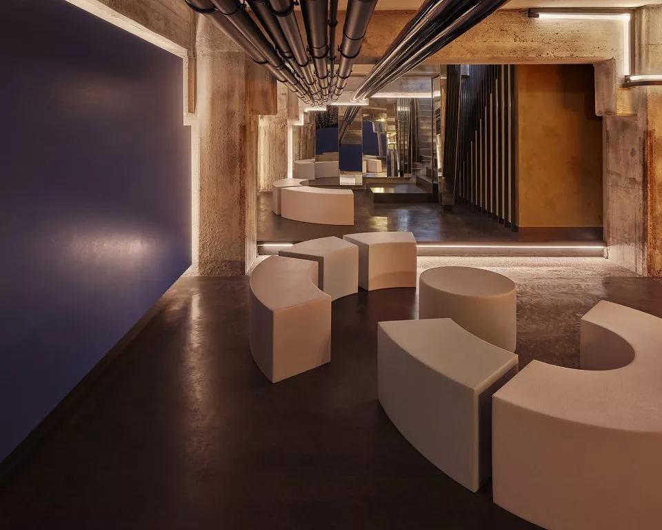 室內(nèi)的定制家具和精致的配色方案受到了陶瓷生產(chǎn)過(guò)程的啟發(fā):空間中的藍(lán)色、灰色、粉紅色和黃色涂料呼應(yīng)了生產(chǎn)工藝的開(kāi)端,利用水和黏土塑造出類似于陶器模具的體量。陶器模具的形狀以及用于生產(chǎn)陶器的工具被再次利用,成為造型獨(dú)特的工業(yè)吊燈,并將室內(nèi)空間劃分為不同的區(qū)域。堅(jiān)硬的幾何形狀與柔軟黏土塑造出的形體共同構(gòu)成了大膽而和諧的內(nèi)部空間。