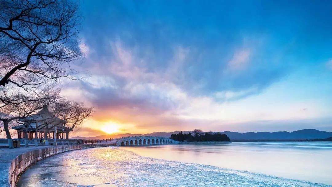 雖然沒有趕上“金光穿孔”的時候,但冬季的頤和園卻有著別樣的美。左側利用樹木,在突出季節特征的同時,將草木、亭子、夕陽結合起來,讓十七孔橋變得生動、鮮活。
