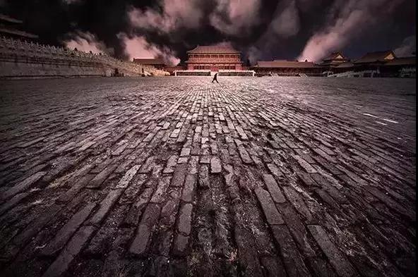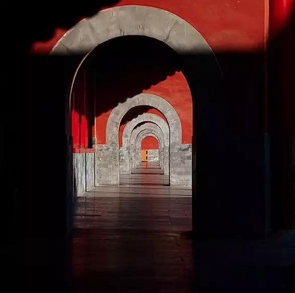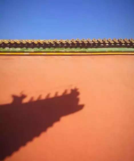 藍色的天空,紅色的宮墻,屋檐的影子打在宮墻上,加強了色彩的對比,讓畫面更加簡潔。