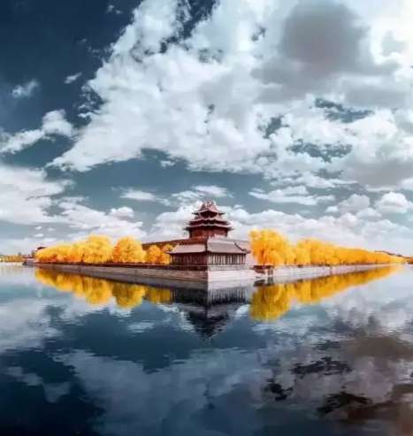 這張故宮角樓,利用天上的云朵,以及水面,讓建筑與倒影遙相呼應,清麗動人,在云卷云舒中,展示著它的美麗。