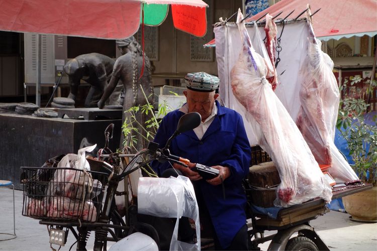 賣羊肉的流動攤販。當地的羊肉價格和我們家鄉差不多,30多元一斤,不過都是帶著骨頭的,好大好肥的羊肉耶。導游是濟南人,他每次回家探親都買很多的羊肉用保鮮箱發回家。