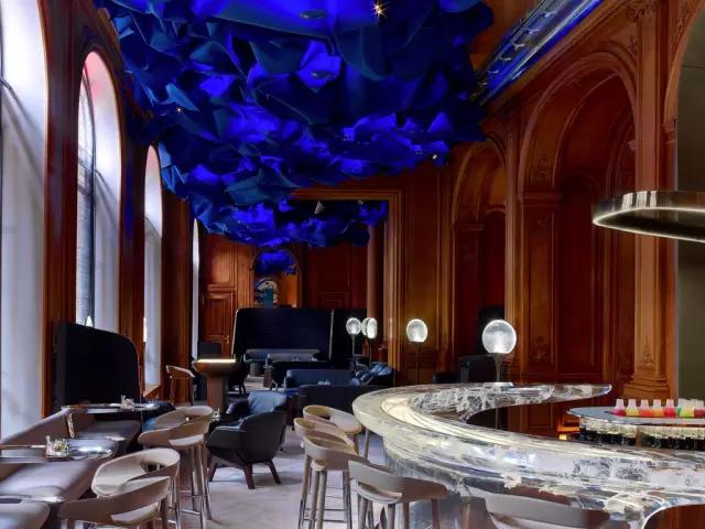 巴黎Plaza Athénée酒店的Le吧的設(shè)計,展現(xiàn)了古典建筑與現(xiàn)代藝術(shù)的完美融合,天花頂?shù)乃{(lán)色云朵裝置是最大的亮點,現(xiàn)代的創(chuàng)意家具讓空間品位十足,也體現(xiàn)了巴黎的優(yōu)雅。