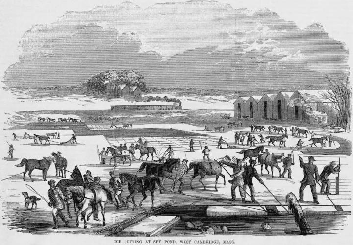 Spy Pond, Arlington 開采河冰的場景。都鐸的手下發明了一種用馬拉著的鐵質刀具切割河冰。