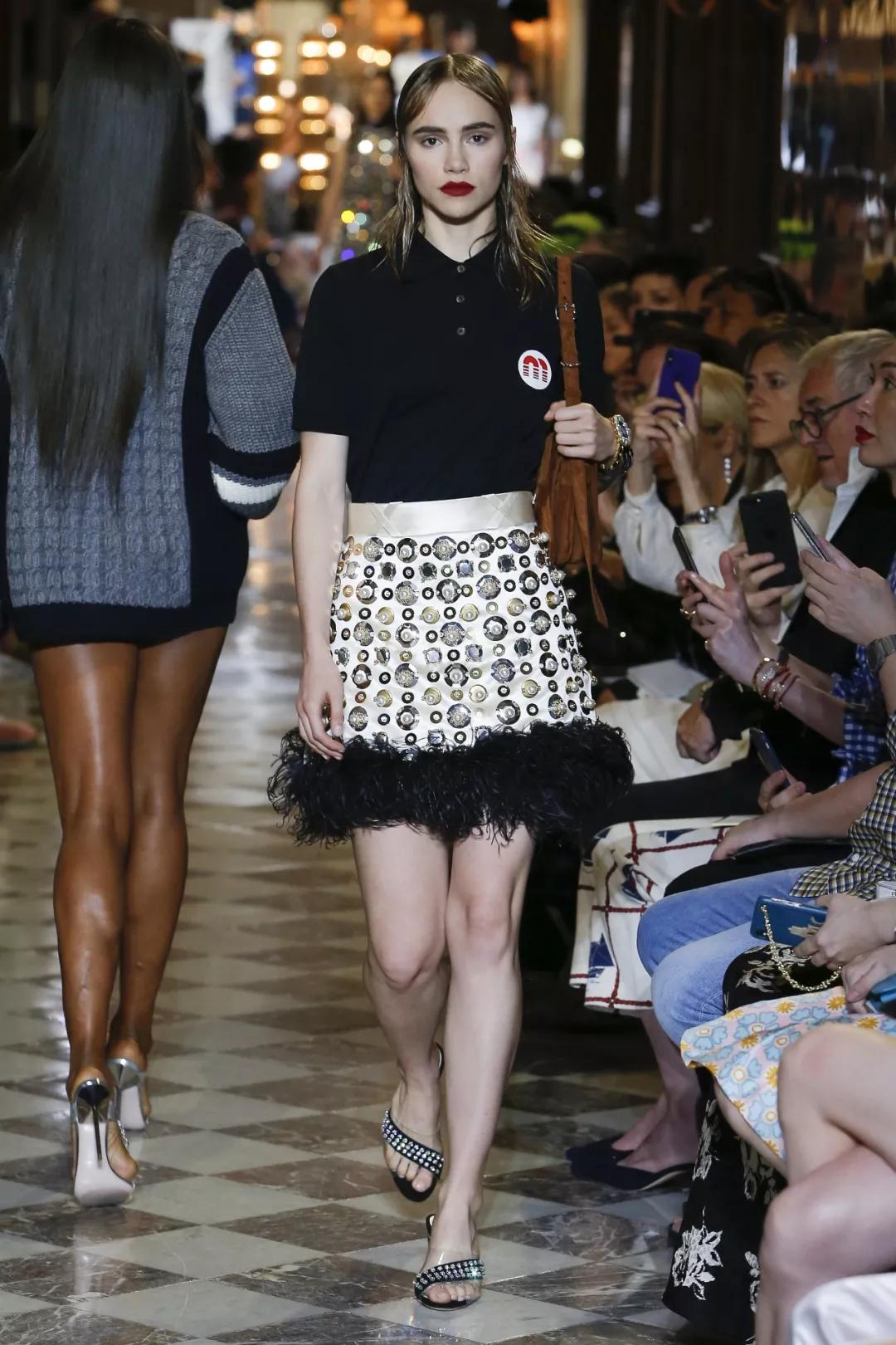 以Miu Miu 2019春夏度假系列為例,A型裙搭配Polo衫,完美再現了赫本風貌,可裙子上的釘珠和羽毛,還是給《羅馬假日》中的淑女氣增添了幾分叛逆和華美,穿成這樣去度假,才是少女感的正確打開方式。