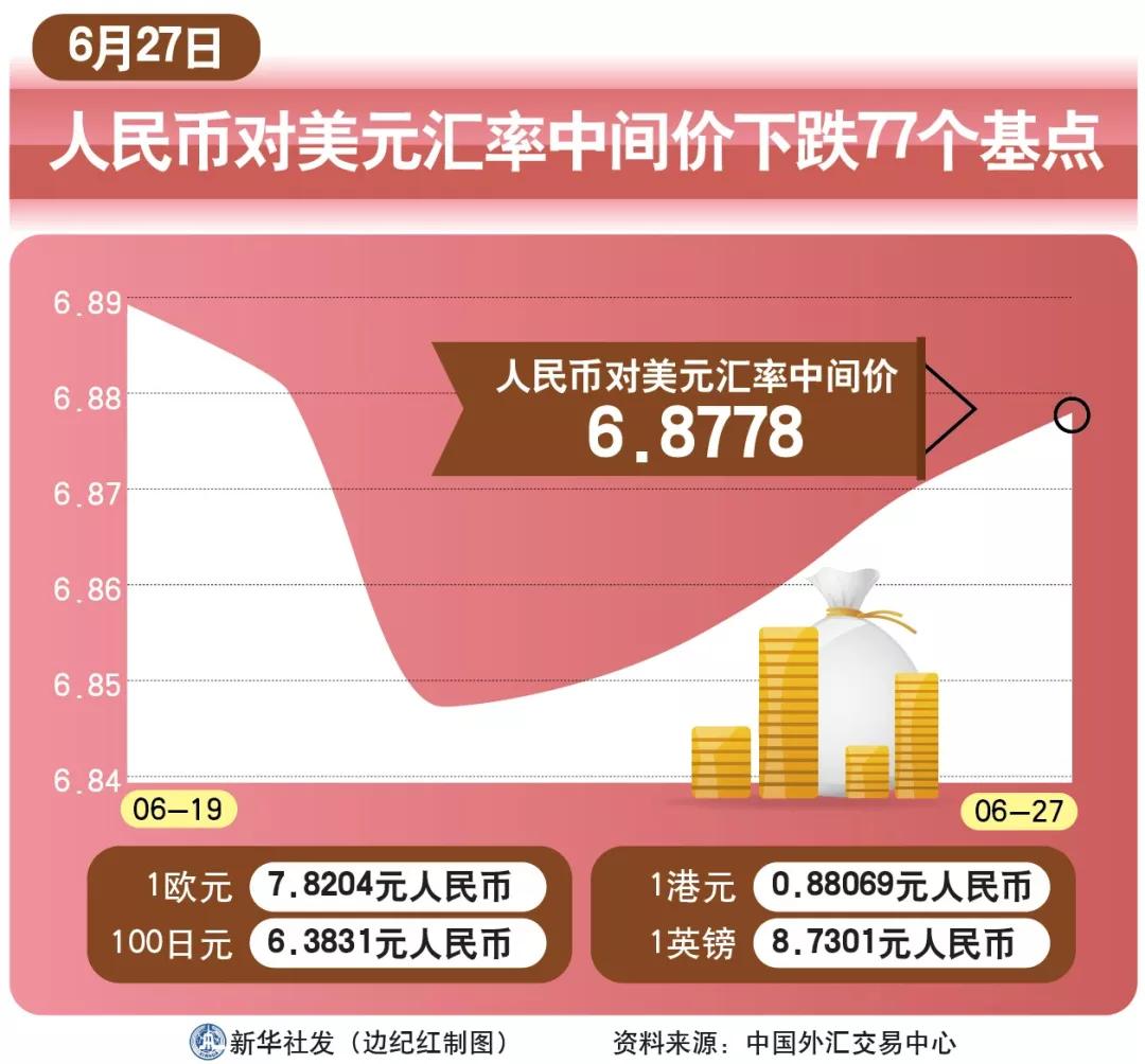·27日人民幣對(duì)美元匯率中間價(jià)報(bào)6.8778,較前一交易日下調(diào)77個(gè)基點(diǎn)。