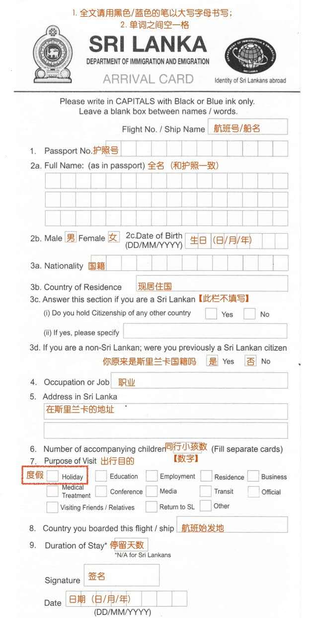 國際游客在進(jìn)入斯里蘭卡都需要填寫入境卡(12歲以下算同行兒童,兒童人數(shù)需要填寫在成人的入境卡上)。乘客可以在飛機(jī)上向空乘人員領(lǐng)取,填好表格后在過海關(guān)時(shí)交給工作人員就好。