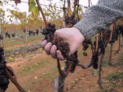 你以為這些真菌會轉化成貴腐菌嘛,too young!只有氣候極其合適的時候這些真菌才會發展成貴腐菌,大部分時候它們只配叫灰霉,能做的所有事情就是搞爛你的葡萄。趕上秋雨連綿的時候,大規模爆發的真菌侵染簡直是“車禍現場”。