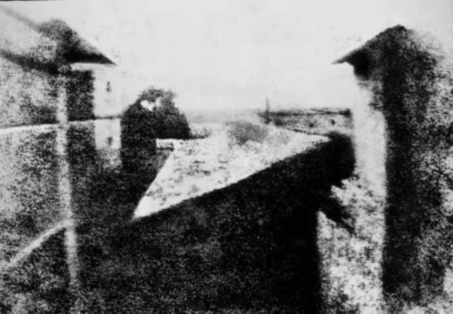 這張照片使用的是照相制版法,在一只小盒子里面放一片白蠟板,上面有感光鹽涂層,附有鏡頭。涅普斯從他在索恩河畔沙隆的鄉(xiāng)間住所的樓上窗口,拍攝了他的第一張照片,曝光時(shí)間約為 8 小時(shí)。
