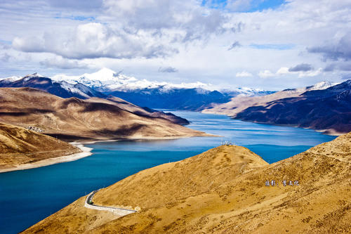 這里是俯瞰羊卓雍措湖的最佳地點(diǎn):山頂上有云層覆蓋,在湖面投下巨大的不規(guī)則身影。蔚藍(lán)的天空與湖水相映。純凈的湖水在陽光下呈現(xiàn)深淺不同的藍(lán)色:淺藍(lán)、深藍(lán)、孔雀藍(lán),還有一些是綠色的。平靜的湖面皺起魚鱗般的細(xì)小波浪,那一汪碧水是如此地深邃,奪人魂魄。