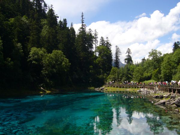 【黃龍景區】黃龍風景名勝區,位于四川省阿壩藏族羌族自治州松潘縣, 是中國唯一保護完好的高原濕地,在一條由南向北逐漸隆起的山脊上。 黃龍風景名勝區面積700平方千米,與九寨溝相距100千米,海拔1700~5588米。核心區域點綴著三千多個彩池。以結構奇巧、色彩豐艷的地表鈣華景觀為主景,由黃龍溝、丹云峽、牟尼溝、雪寶鼎、紅軍長征紀念碑碑園等組成。主要景觀集中于長約3.6公里的黃龍溝,溝內遍布碳酸鈣華沉積,并擁有豐富的動植物資源。
