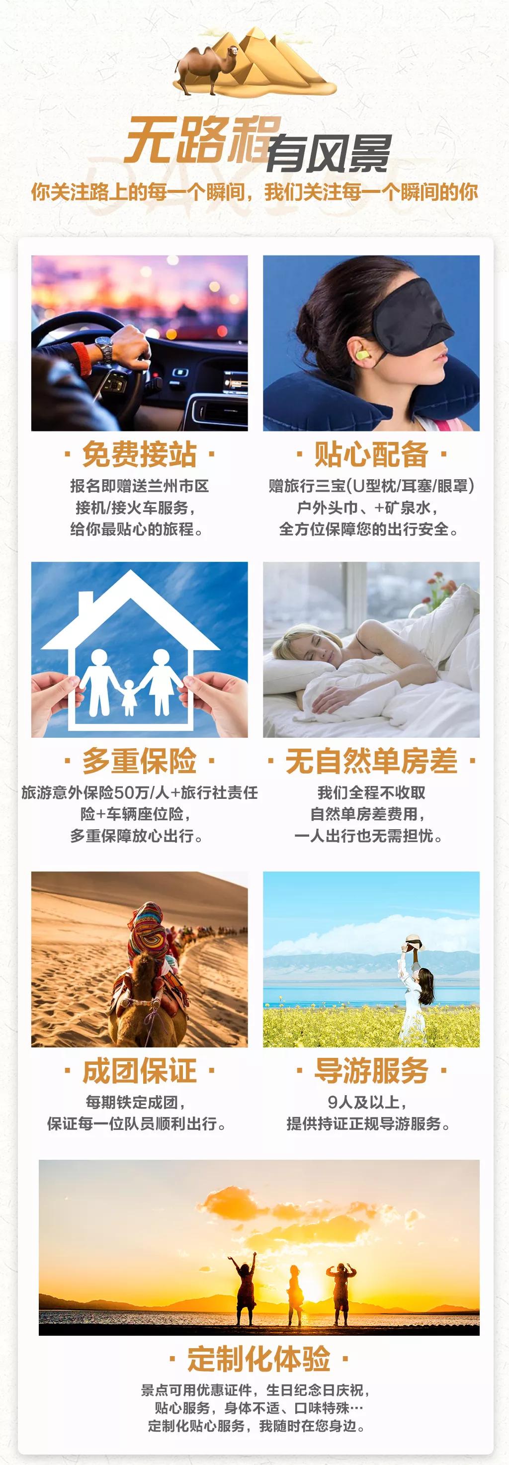 贈送:贈送特色敦煌沙漠BBQ;特贈獨家定制許愿瓶禮盒,許你獨家記憶;贈送貼心禮包旅游三寶、魔術頭巾、礦泉水;贈送蘭州市區接機/接火車服務,23點后由于運管規定不能接機/接站,敬請諒解。(贈送項目不用費用不退)