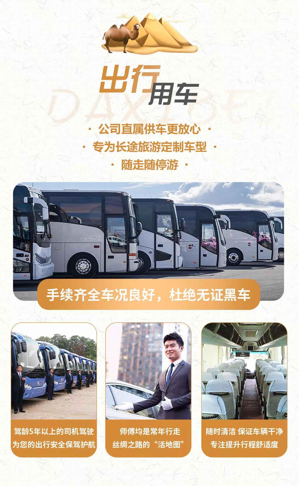 交通:全程正規空調旅游車出行,保證一人一正座位,車型大小根據實際人數安排,且由駕駛經驗豐富的司機為您的出行保駕護航,報價包含車費、油費、停車費、維修費及司機勞務費。