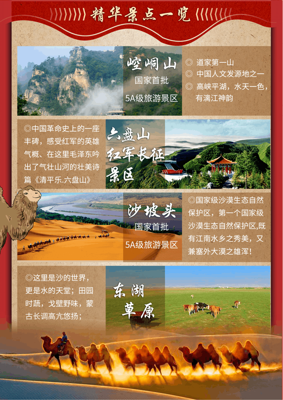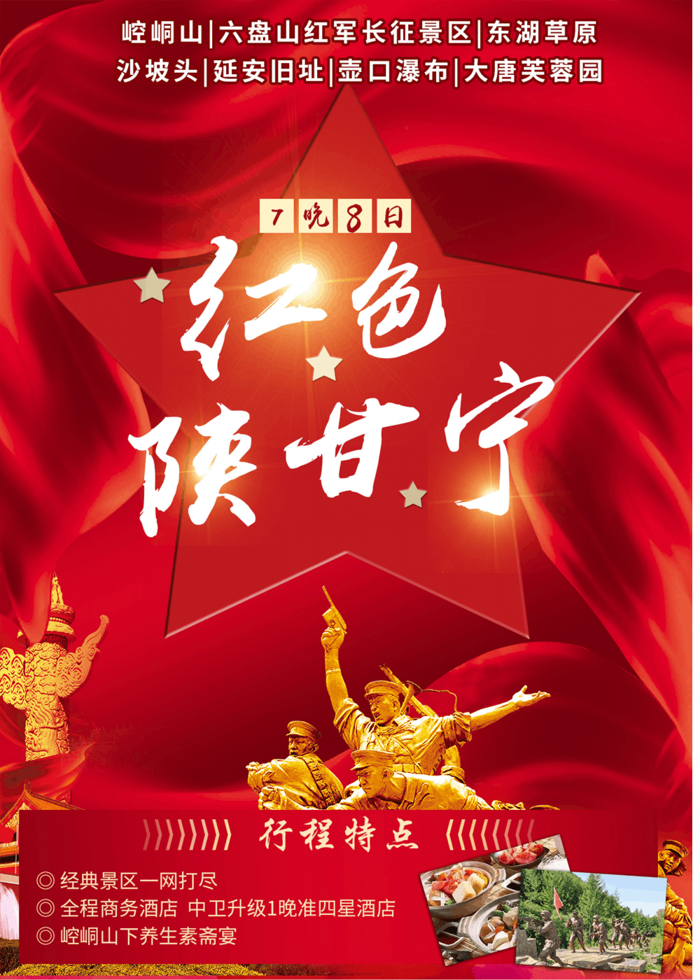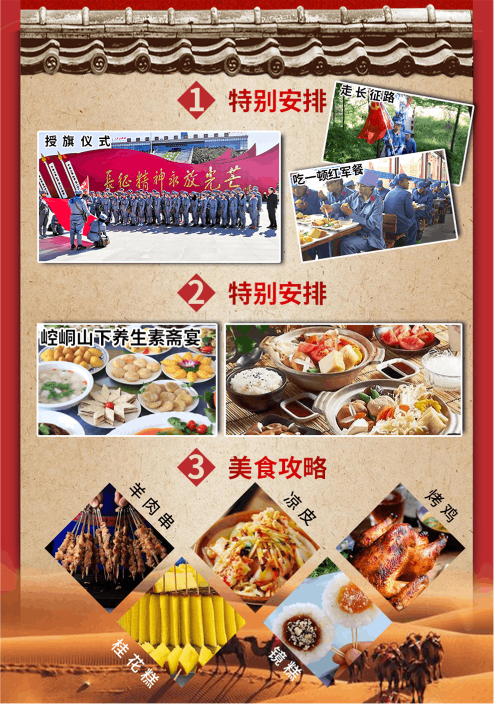 特別安排:【授旗儀式】—到達景區,換上紅軍服裝,按照長征中紅一、紅二、紅四方面軍的編制,分為三隊。由活動領隊致辭,向各隊隊長授旗!大家齊聲朗誦《清平樂.六盤山》,伴著“不到長城非好漢”的壯志豪情,高舉紅軍旗,身著紅軍服向山頂進發。