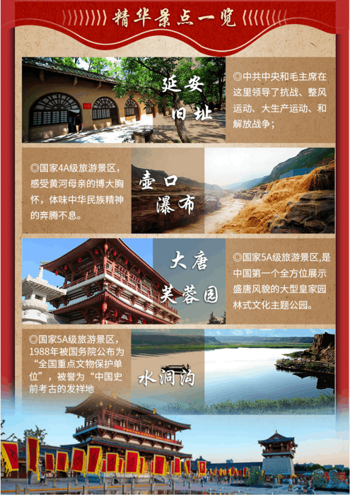 早餐后赴延安游覽原中共中央駐地——【楊家嶺】(游覽時間不低于30分鐘),中共中央和毛主席在這里領導了抗戰、—【壺口瀑布】(車程約3小時左右,游覽時間不低于50分鐘),感受黃河母親的博大胸懷,體味中華民族精神的奔騰不息。“君不見黃河之水天上來,奔流到海不復還”。結束后赴富平入住酒店休息!(壺口—富平240公里,車程約4小時左右)