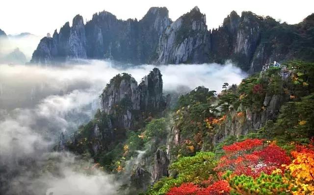 黃山的秋季,別有種種勝景,明代大旅行家徐霞客曾贊美黃山秋色“楓林相間,五色紛披,燦若圖繡”。