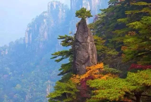 秋用赤、橙、黃、綠、青、藍、紫七色神筆把黃山描繪得色彩斑斕,濃墨重彩地勾勒燦若圖繡的世界,遠峰近松,到處充滿了秋色的誘惑,讓人難以抗拒。