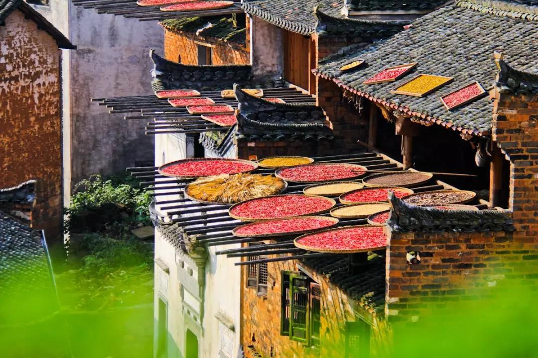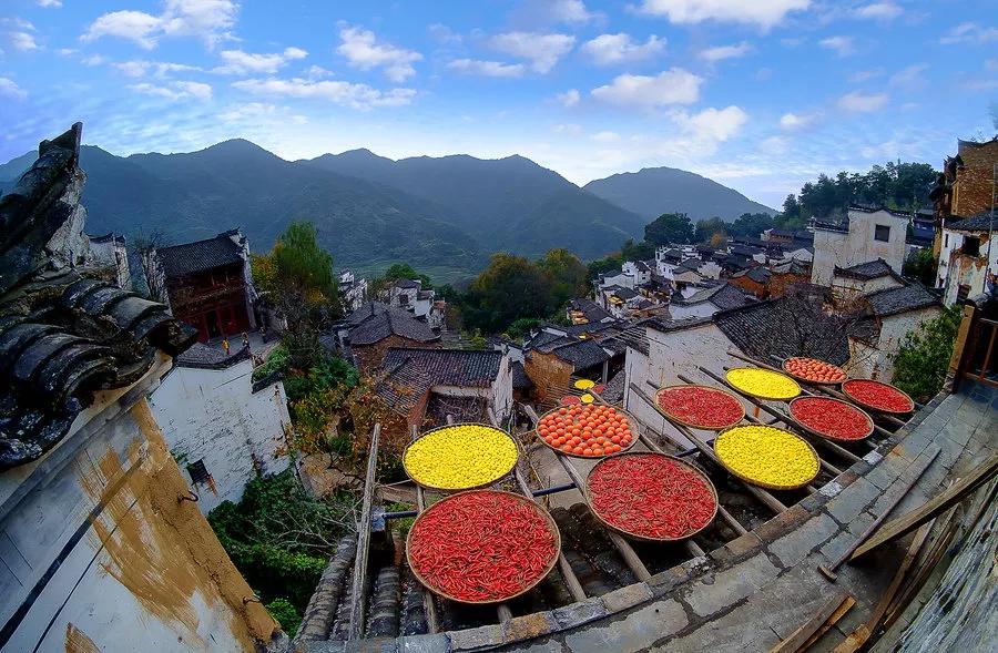 篁嶺的秋天不是北方漫天遍野的金黃,而是晾曬在屋頂?shù)娜宋那锷?