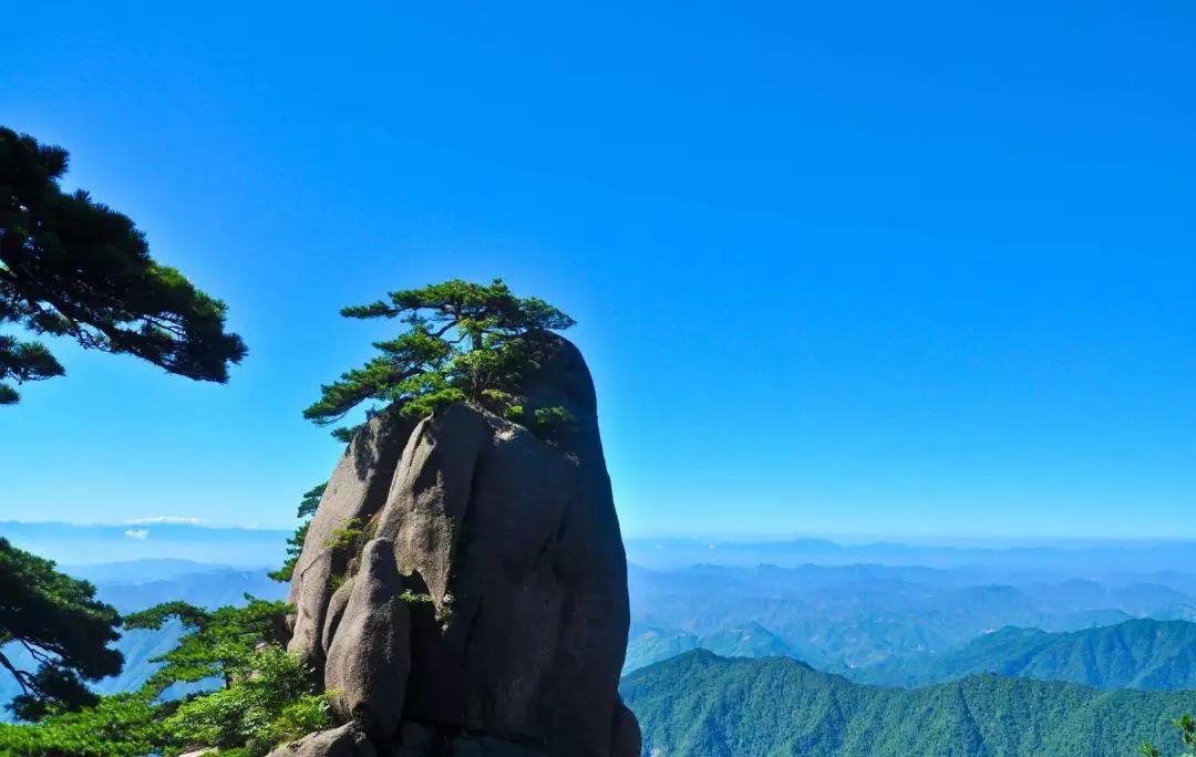 仰望天空,黃山的天湛藍如洗,入了秋更顯得高遠,空曠無邊、萬里無云,更無一絲雜質(zhì),像一塊覆蓋大地的藍寶石。