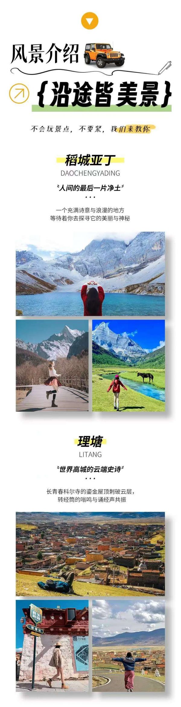 但領(lǐng)隊(duì)進(jìn)景區(qū)拍攝需要同車一起AA領(lǐng)隊(duì)門票費(fèi)用,門票預(yù)估:紅海子清潔費(fèi)15-30元/人;魚子西/格底拉姆/八郎生都清潔費(fèi)30元/人;稻城亞丁(旺季價(jià)格)門票+觀光車266元/人、(淡季價(jià)格)門票+觀光車240元/人、沖古寺服務(wù)區(qū)至洛絨牛場(chǎng)電瓶車往返80元/人,單程50元/人(可選擇)、洛絨牛場(chǎng)往返騎馬費(fèi)用300元/人,價(jià)格隨季節(jié)浮動(dòng)(可選擇,不建議乘坐);理塘:套票100元/人。