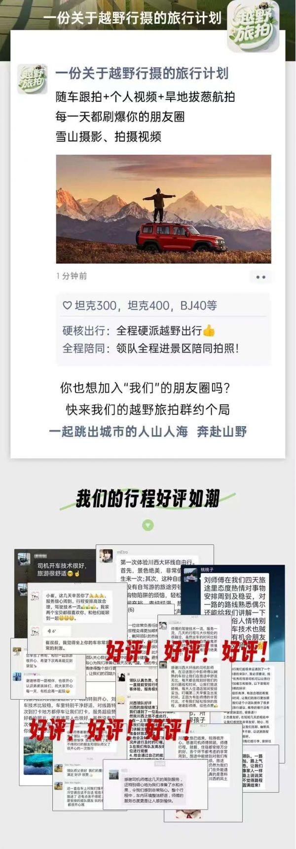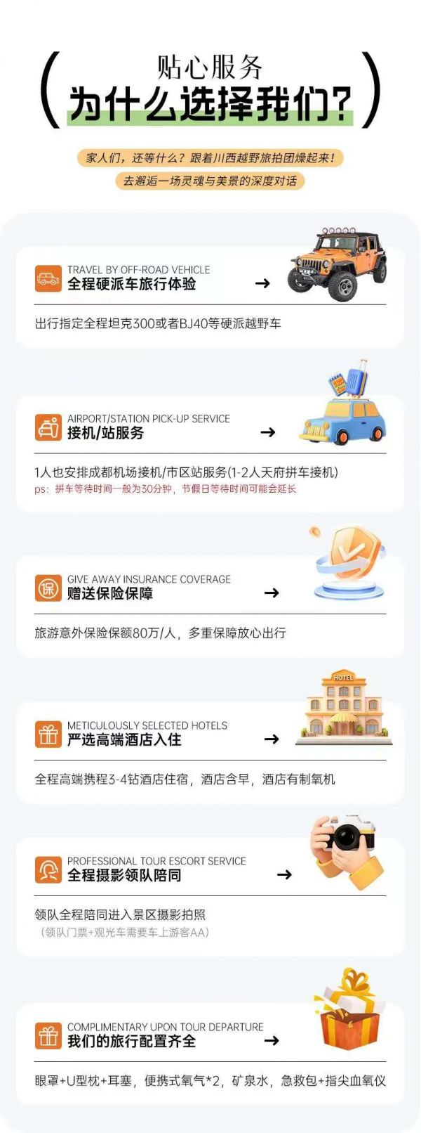 (3)本線路沒有“代購業務”,請不要在團隊中或者完團后,請求駕駛員代購任何產品,如有需要請自行篩選、購買。
