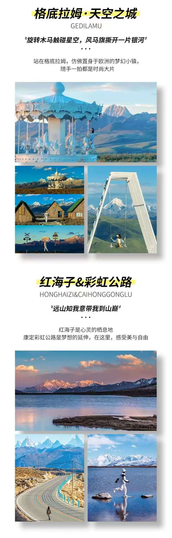 紅海子觀景臺和魚子西/格底拉姆/八郎生都的氣溫較低,要攜帶足夠的保暖衣物,如羽絨服、毛衣、圍巾等。在觀景臺拍照時,注意安全,不要靠近懸崖邊緣或危險區域。