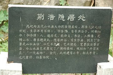 荊浩中國山水畫藝術的開山式人物,公元一千二百多年前的晚唐五代時期,隱居于洪谷山,自號洪谷子,開創以描繪高山峻嶺為特色的北方山水畫派。荊浩的畫風后來由關仝、李成和范寬繼承,演變成開圖千里的“巨碑式”山水,荊浩成立中國山水畫鼻祖,洪谷山成為中國山水畫發源地。