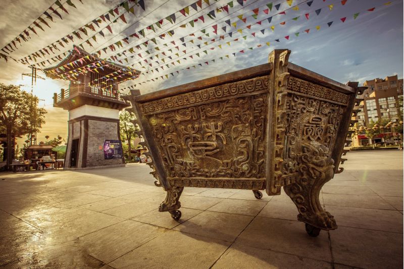 【九鼎廣場(chǎng)】是展示鼎文化的場(chǎng)所,廣場(chǎng)上每天舉行祭鼎活動(dòng)和游客參與的歌舞活動(dòng)。廣場(chǎng)上建有春秋樂(lè)宮,展示春秋時(shí)期的樂(lè)器,打造春秋音樂(lè)會(huì)。