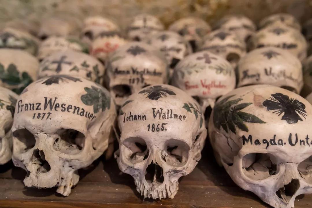 刻上姓名和生卒年月的頭骨被堆疊在一起