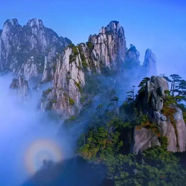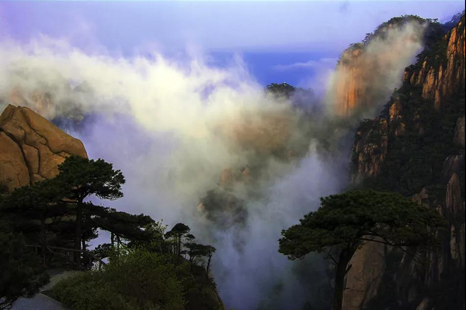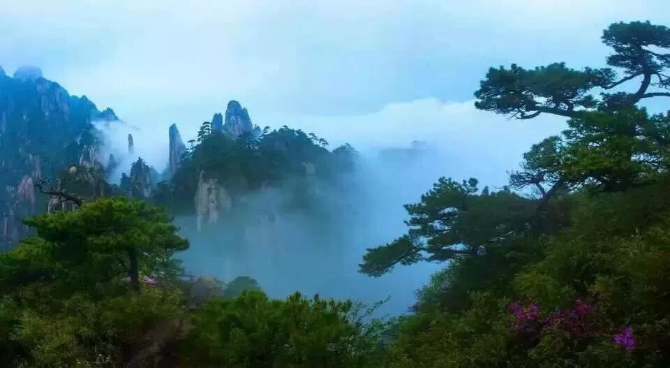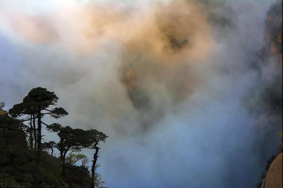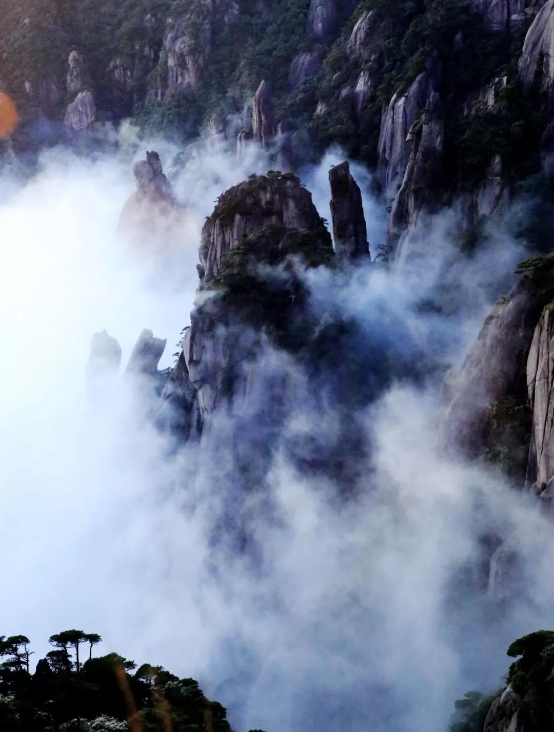 山間云海翻滾,變幻莫測(cè);奇峰危崖,變成了一座座蓬萊仙山,方嘆峰巒骨骼清奇,轉(zhuǎn)瞬又消失于云霧中,動(dòng)如脫兔,靜如處子,動(dòng)靜變幻,神奇詭秘......目不暇接,流連忘返。